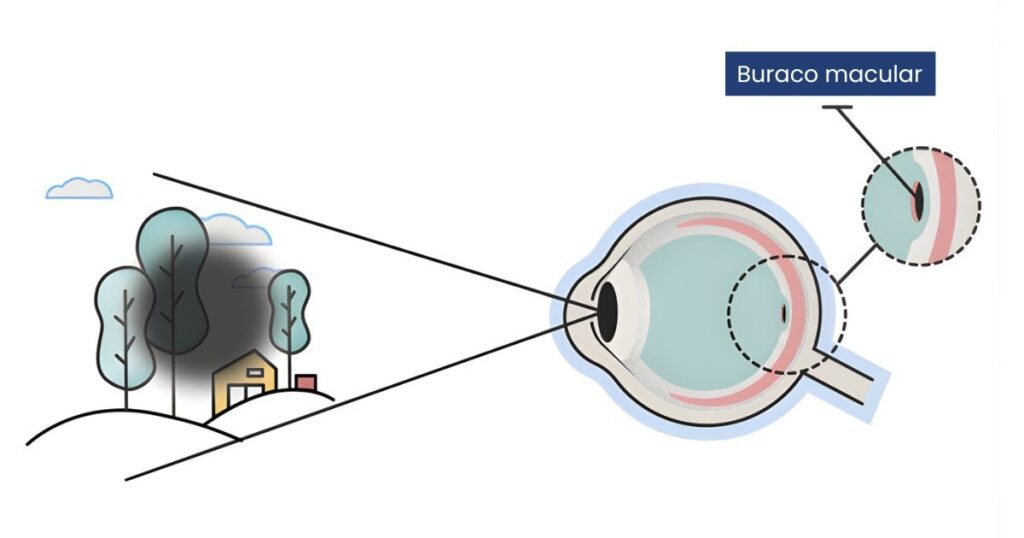O buraco macular afeta a visão central, responsável por detalhes finos, mas a visão periférica permanece preservada.